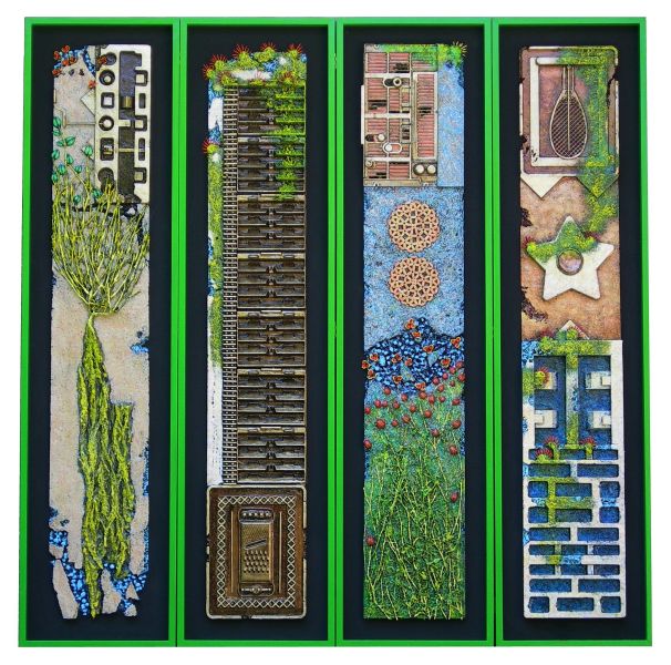 Natura e artificio, polimaterico con materiali naturali e industriali riciclati 120x80