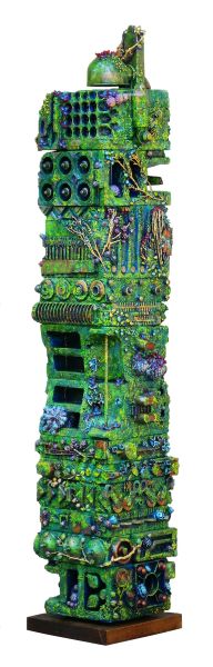 L’aspetto indubbiamente ludico presente in molte, se non tutte, le opere proprio a partire dalla ricerca dei materiali per finire nella scelta dei colori, sempre molto accesi, utilizzati; il gioco è andato via via raffinandosi per giungere ad essere coscienza operativa e professionale, poetica, una attenta indagine dove la molteplice e multiforme personalità dell’autore, il suo desiderio di espressione, di testimonianza e di denuncia, l’invenzione di tematiche e lo stile peculiare, lo rendono un unicum, un caso a parte nel panorama dell’arte italiana contemporanea. L’artista si salva da uno stato di ansia, presente nelle sue opere che pure nella loro politezza parlano di inquinamenti e di mutazioni genetiche, attraverso il ripensamento ludico, gioioso e ironico, in cui convergono la sua curiosità e fantasia costruttiva, che lo pongono però anche vicino al mondo reale dell’uomo, quello della produzione industriale che crea non solo il nostro benessere ma anche, in qualità di scari appunto, i materiali di base che egli utilizza nei suoi lavori, e come corollario l’inquinamento che qui, non dichiaratamente, viene evocato.