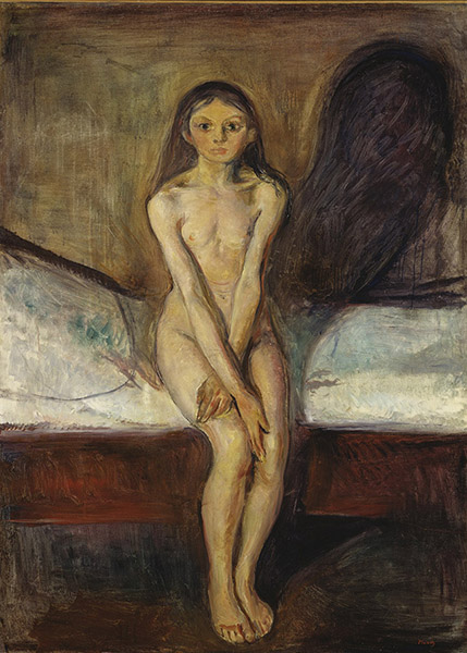 Nel d’après Pubertà (2017) l’adolescente di Edvard Munch è cresciuta, il seno si è sviluppato ed è scomparsa l’ombra del fantasma del futuro che appariva dietro la fanciulla trasformandosi nella sua di ombra, segno di avvenuta maturità sessuale.