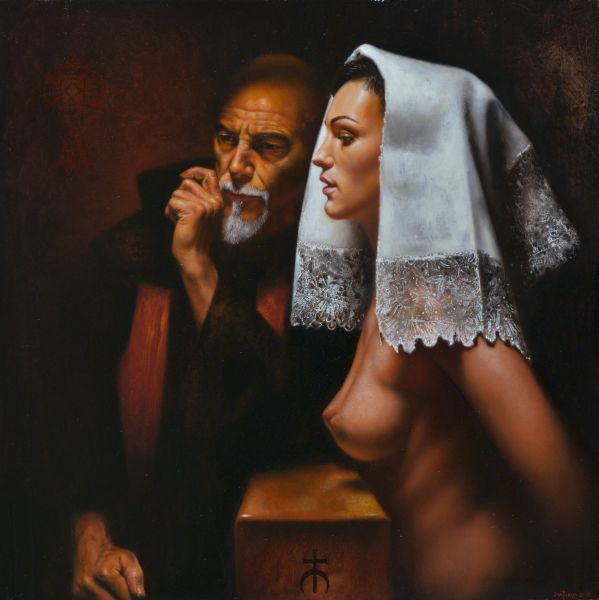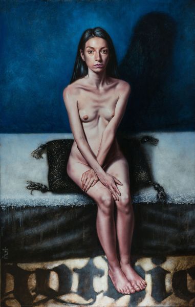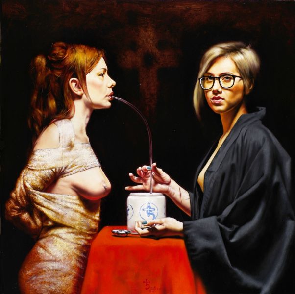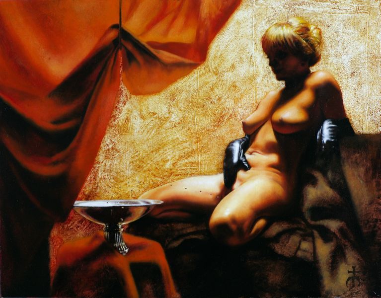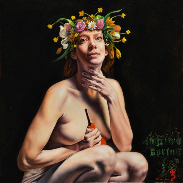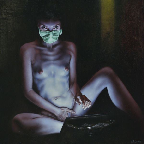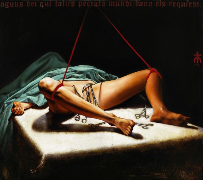 modo sempre celati alla vista, come uno sguardo come in Ingrid spring (2013), dove per altro una particolare componente erotica è data dalla peretta di gomma che la figura chiude nella mano destra. Frequenti e ripetuti i particolari “ospedalieri” inseriti nelle opere: forcipi - pinze - tubicini - ecc, ed un non celato accenno di necrofilia velato da un leggero sadismo
